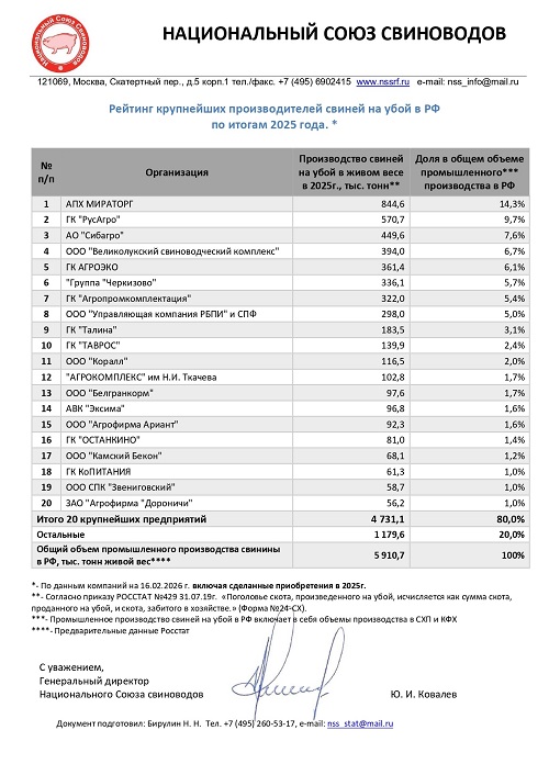 НСС опубликовал рейтинг производителей свинины по итогам 2025 года Национальный союз свиноводов (НСС) представил рейтинг ТОП-20 ведущих игроков отрасли по итогам 2025 года,